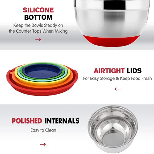 Mixing Bowls with Airtight Lids, 20PCS Stainless Steel Set, Nesting 3 Grater Attachments & Non-Slip Bottoms, Size7, 4, 3, 2, 1.5, 1QT for Baking&Prepping